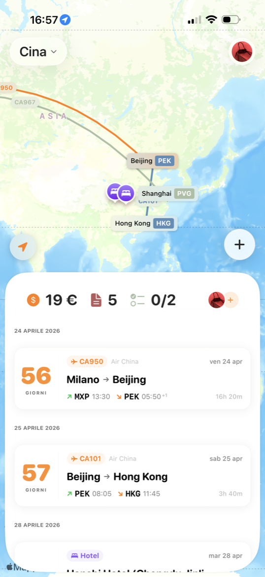 Voli, hotel, attività — tutto in una timeline ordinata. Scansiona documenti e i dati si compilano da soli.